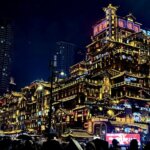 洪崖洞は、レストランやホテル、土産屋などが入った11階建の商業施設。