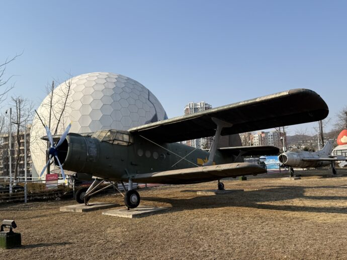 まわりを一周見渡すと、先には戦闘機が並んでいるエリアがあった。物騒な展示だ。