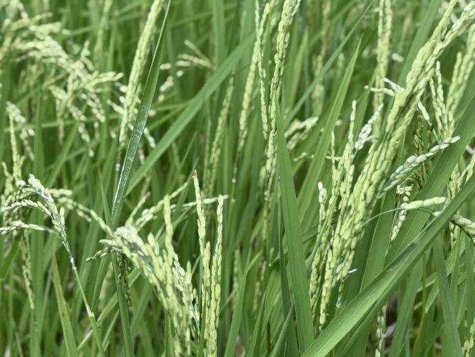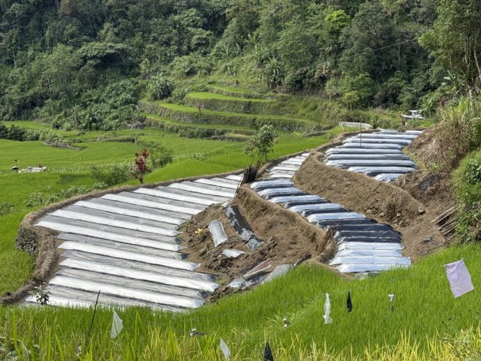 ピカピカひかるのは、畑にかけられたビニール。お米から作物に切り替えのだろうか。