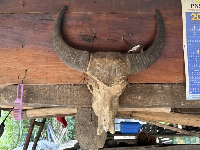 家屋には、頭部が掲げられている。魔除けだろうか。