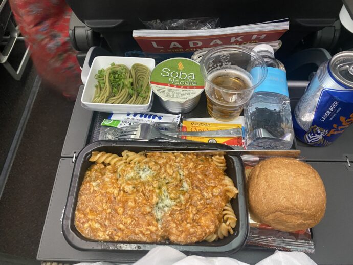 離陸したら眠ってしまったけれど、ちゃんと機内食前には目を覚ますことができた。牛丼を選びました。パンもついてきた。