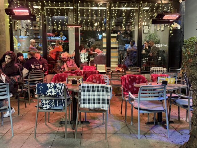 酷寒のプリシュティナ。みな暖房のそばで暖まりながらおしゃべりしてる。